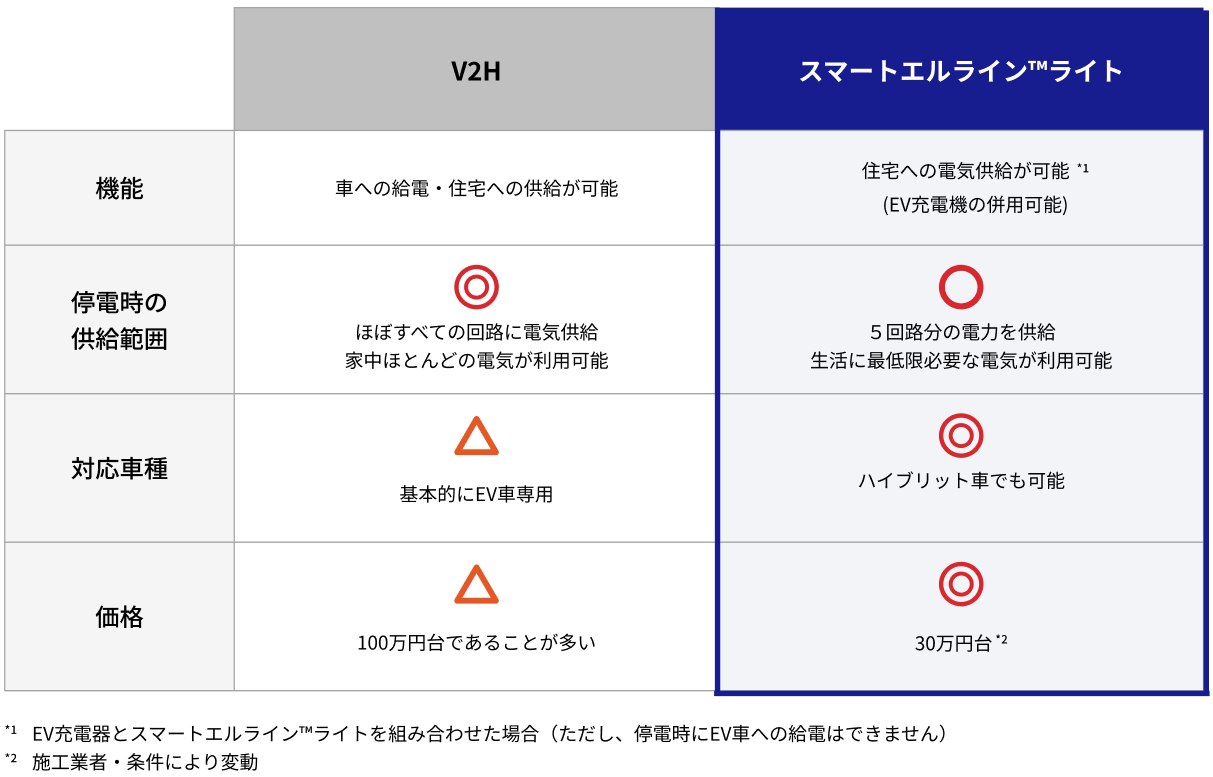 「スマートエルライン™ライト」はV2Hと同様に、住宅への給電が可能ですが、電力の供給範囲・対応車種・価格面で違いがあります。