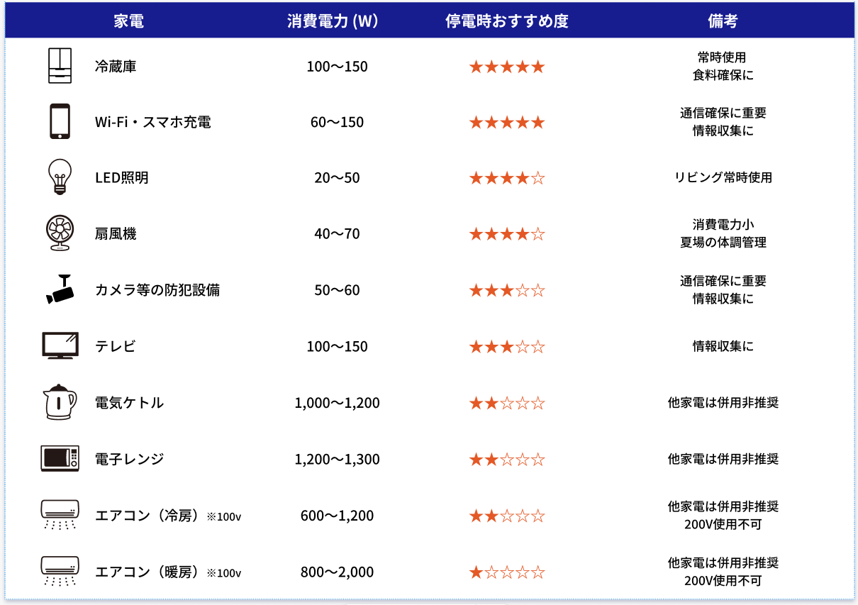 最大1500Wの電力供給が可能であり、1500WではWi-Fiや照明のほか、冷蔵庫やエアコンなども使用できます(エアコンや電子レンジ等は他家電との併用非推奨)。例えば、同時に冷蔵庫の稼働とスマホの充電、LED照明の点灯、扇風機やテレビの使用が可能です。
